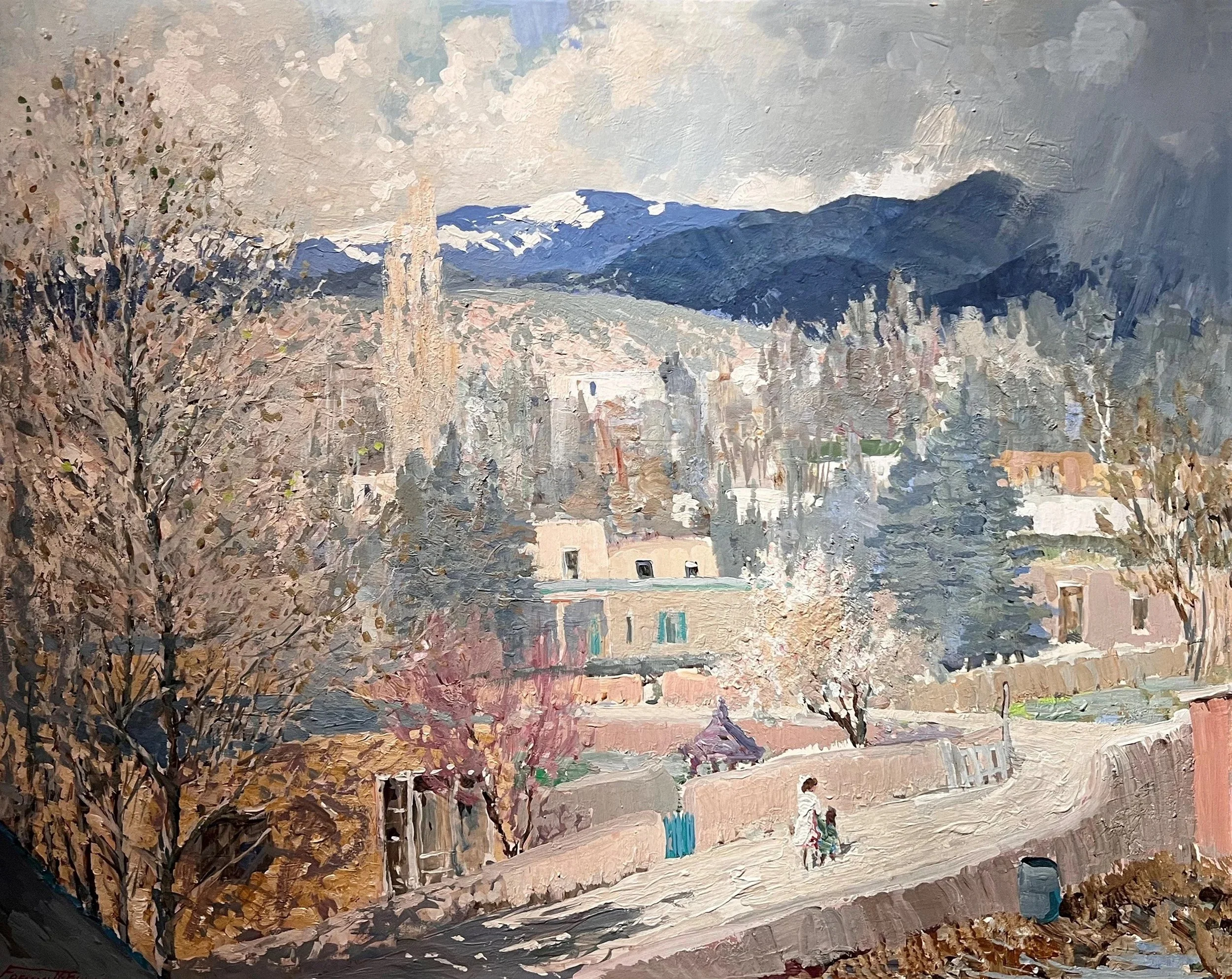 By 1921, Ellis helped co-found an artists’ group in the burgeoning art colony—Los Cinco Pintores, or the “five painters”. The group included Will Shuster, Walter Mruk, Josef Bakos, and Willard Nash, and operated out of their compound of adobe homes on Camino de Monte Sol.